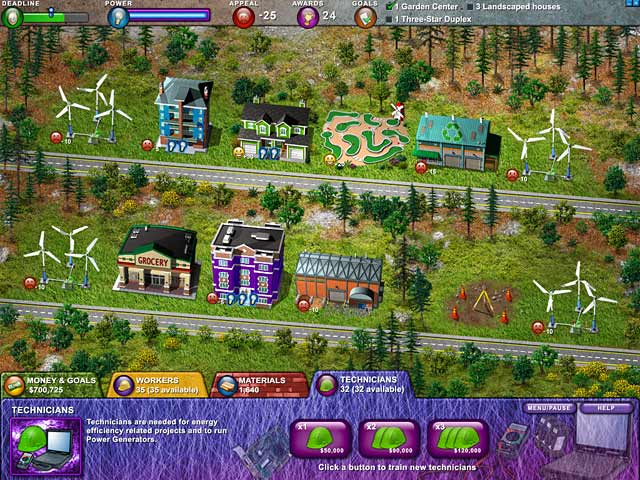 Help friendly towns to grow and glow by building neighborhoods and generating clean energy to make them run in this exciting Time Management game. Watch out for power overload! If you build too fast, you may experience blackouts and unhappy renters. Build solar towers, wind farms, and dispatch technicians to make sure everyone is energy efficient. Make your neighborhoods fit and fancy by building tennis courts, swimming pools, boutiques and more in Build-a-lot 4: Power Source. - Build-a-Lot 4: Power Source