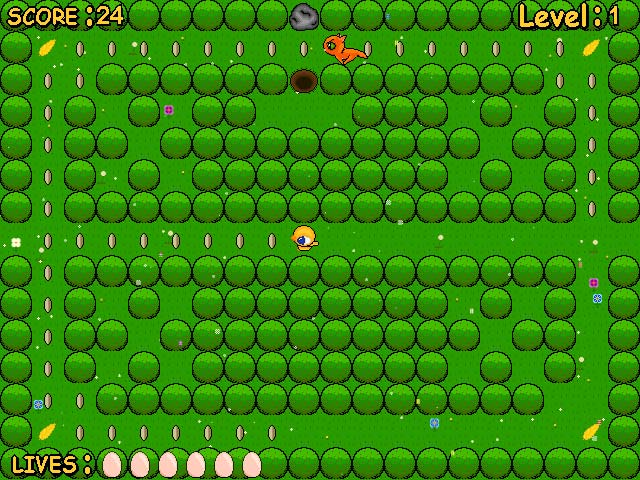 It's harvest time! Play as Chicky or Ducky in this arcade-style game. Your goal is to collect as many seeds as you can before winter sets in. Gather seeds as you navigate through each maze-like level. But look out! You have to avoid the kitty at all costs. Keep an eye out for bonuses, like little worms you can snack on. It's time to harvest fun in Chick Chick Chicky! - Chick Chick Chicky